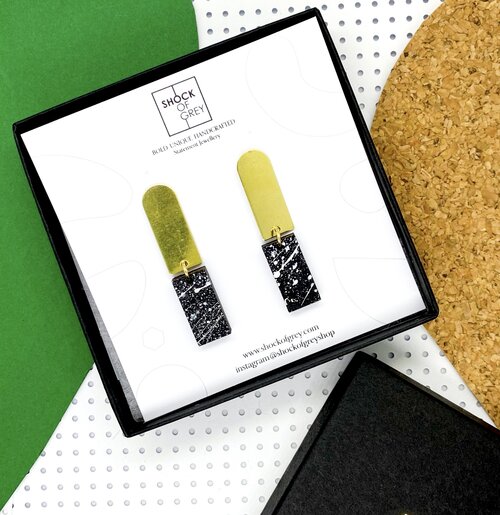 Chrissy Statement Earrings in abstract brass with rectangle of lasercut hand-painted wood in black and white hand painted spatter with stainless steel ear pins.