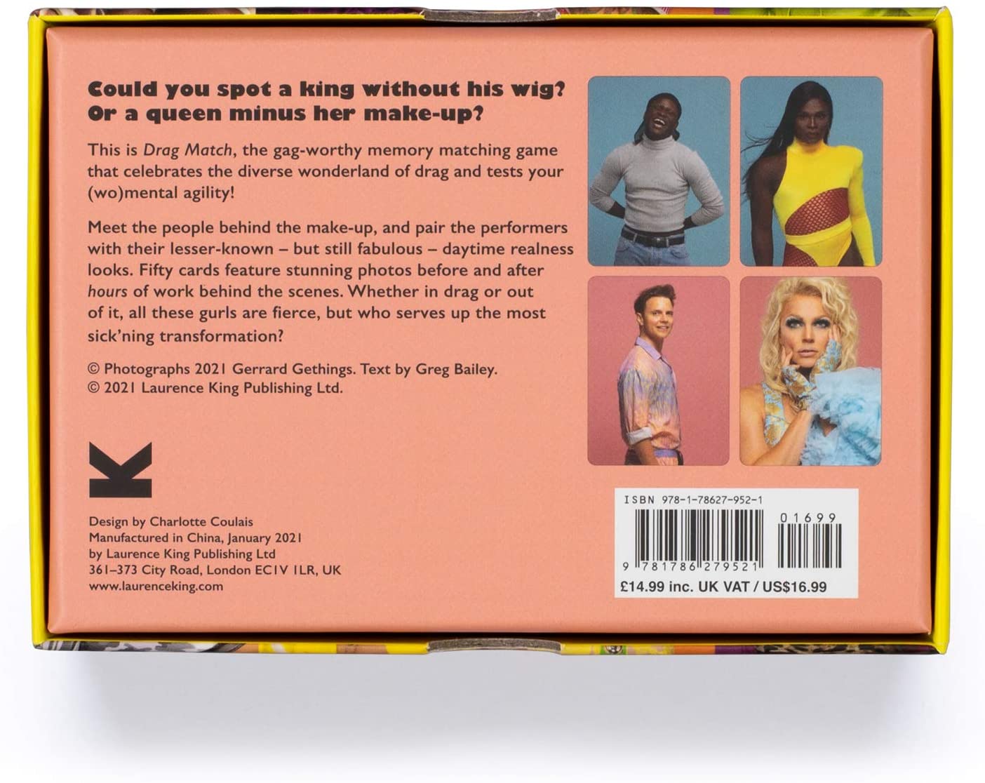 Pair up the queens and kings with their out-of-drag looks in this fabulous new card game. It is much harder than you think, as the transformation is so complete! 50 cards depict stunning before and after photos of the glamorous drag transformation, and texts by Greg Bailey of Alright Darling are included in the accompanying booklet to give an insight into the incredible character creations and the people behind the make-up. Play as a memory game with the cards face down for an added level of difficulty. Collect the most pairs to win! This is the perfect gift for fans of Drag Race.