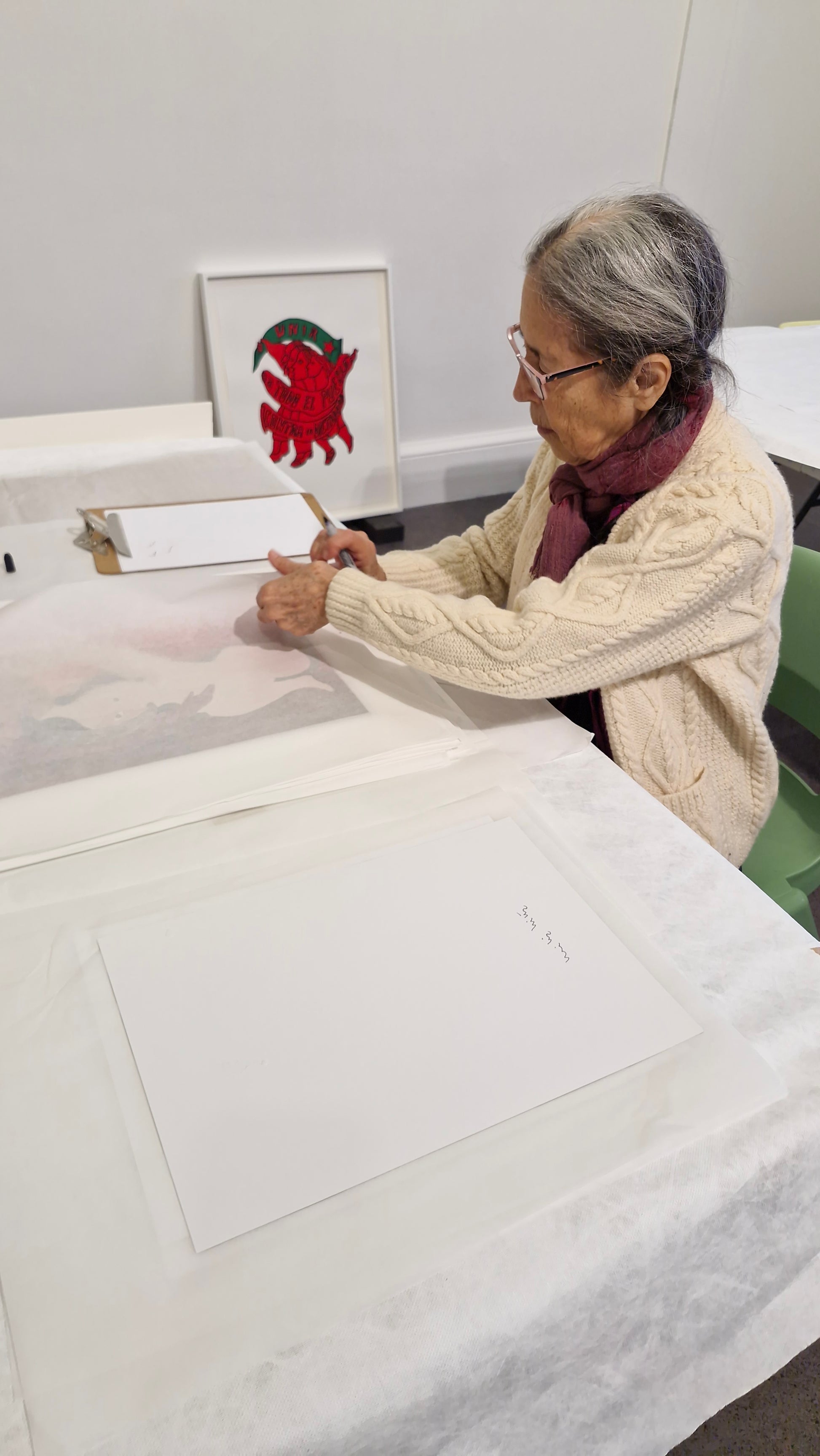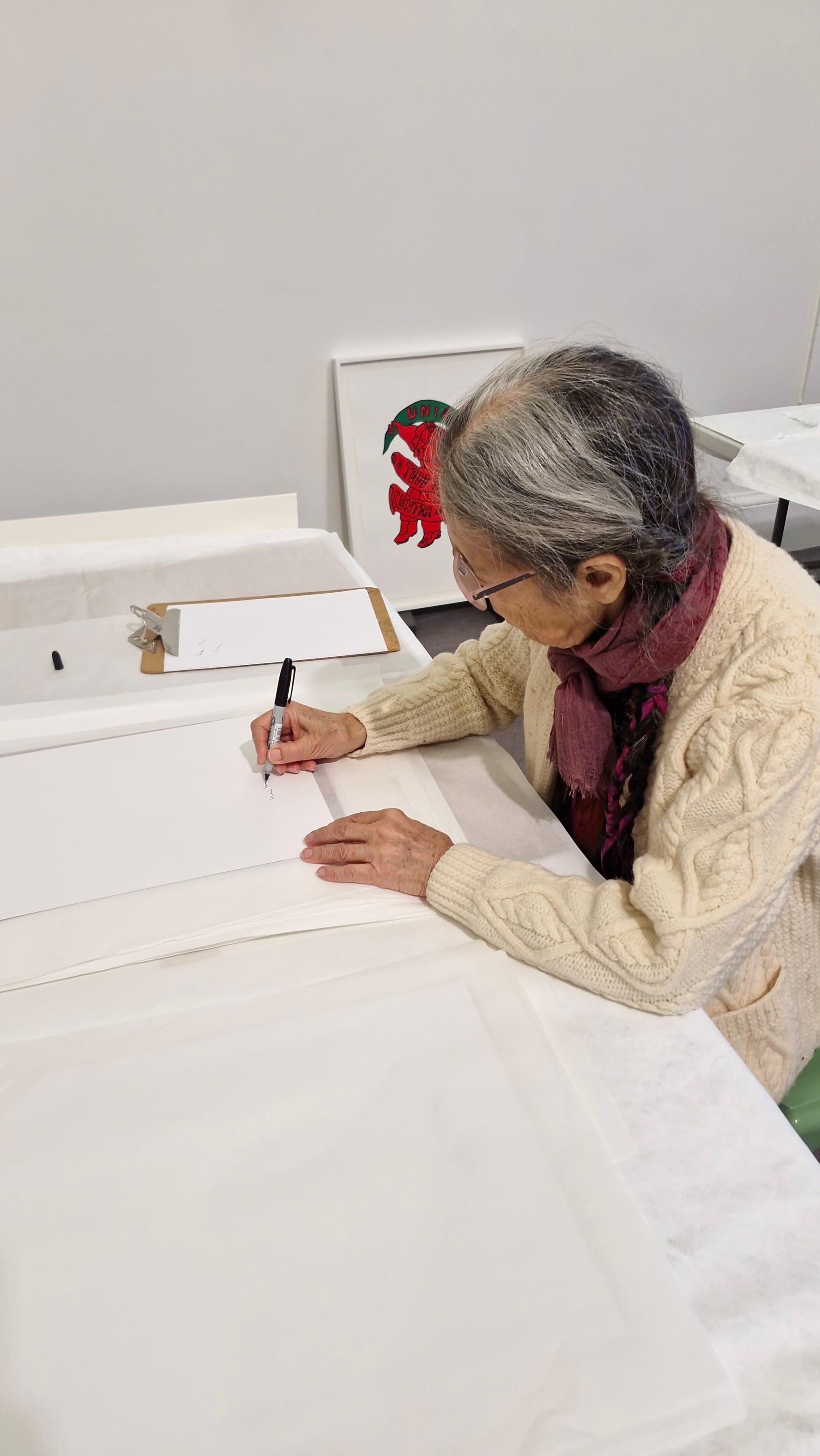 Created on the occasion of renowned artist, poet and activist Cecilia Vicuña's first solo exhibition in Ireland. The exhibition 'Reverse Migration, a Poetic Journey' in which Vicuña delves into themes of ancestry, ecological urgency, and the interconnectedness of humanity inspired by the discovery of her ancient ties to Ireland. The original work 'Mother's Shadow' was created during a difficult period in the artist's life, the figure embracing the female represents the "Mother within," drawing upon the female's ability to self heal.
