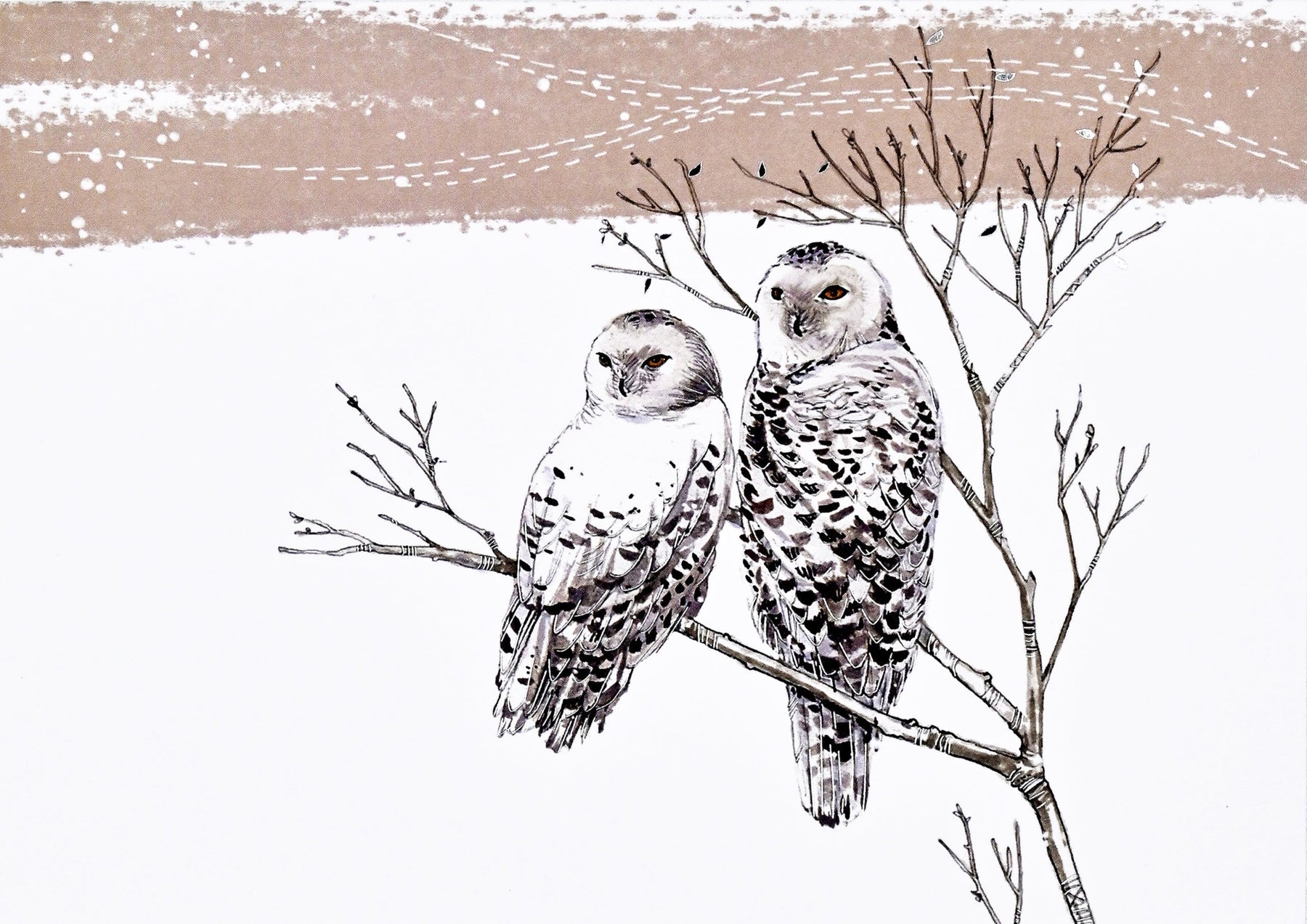 A pair of snowy owls perch on a branch in this serene winter woodland scene.