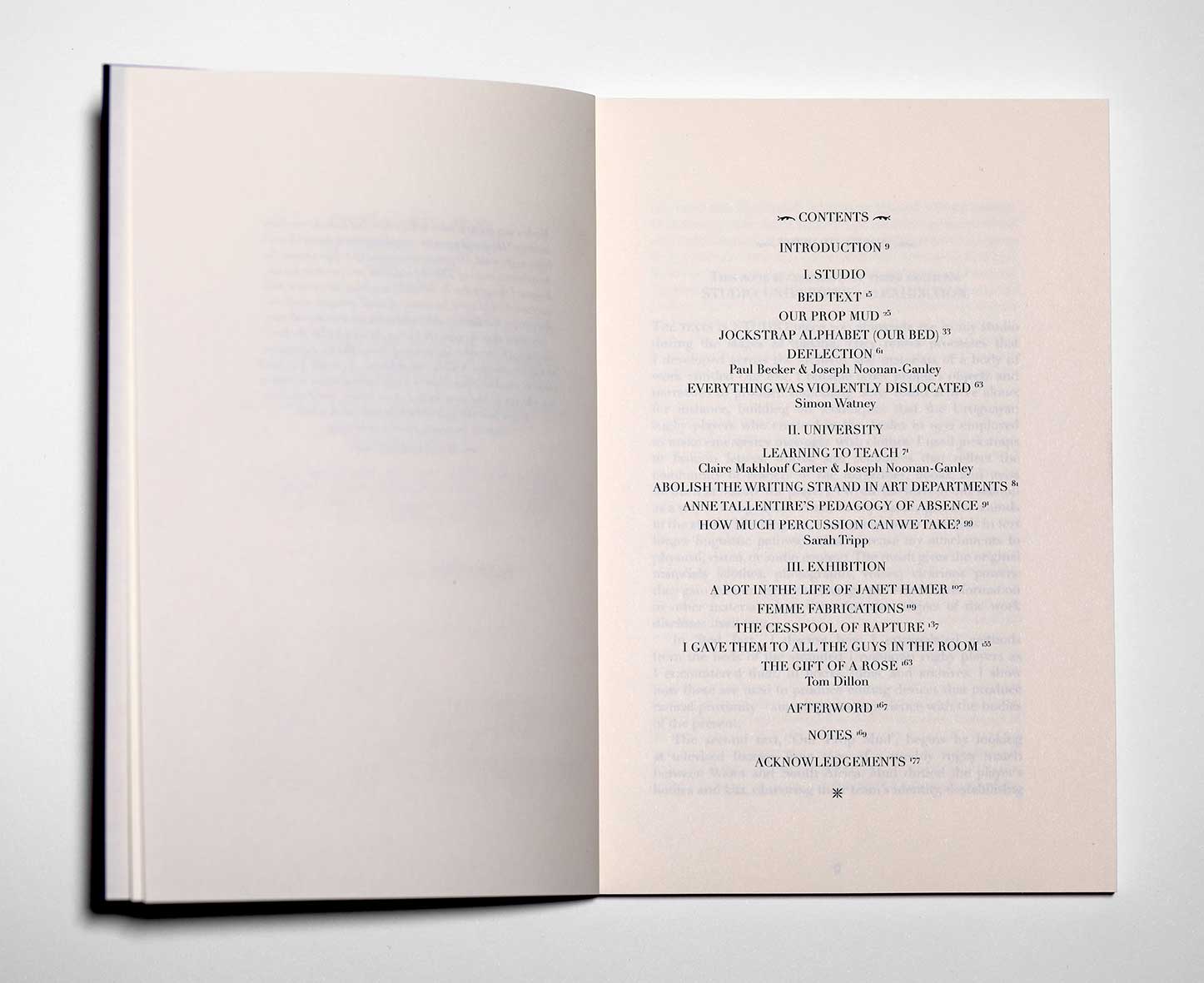 ‘Working in my studio, teaching in universities, and presenting art in exhibitions demand distinct and contrasting kinds of labour that do not easily lead from one to the other. Persisting in any one of these areas is premised on the work and learning undertaken in the others. This assembly demonstrates why I continue to move between these, why movement is generative, essential. This book reconstitutes connections that are suppressed by infrastructural, institutional, and psychic compartmentalisation. These texts were not written to be compiled. They collectively comprise their themes, demonstrating diversity rather than synthesis [...] Objects host shared encounters: when I visit them, I come into contact with the desires of others, and they become contaminated by mine in the process.’