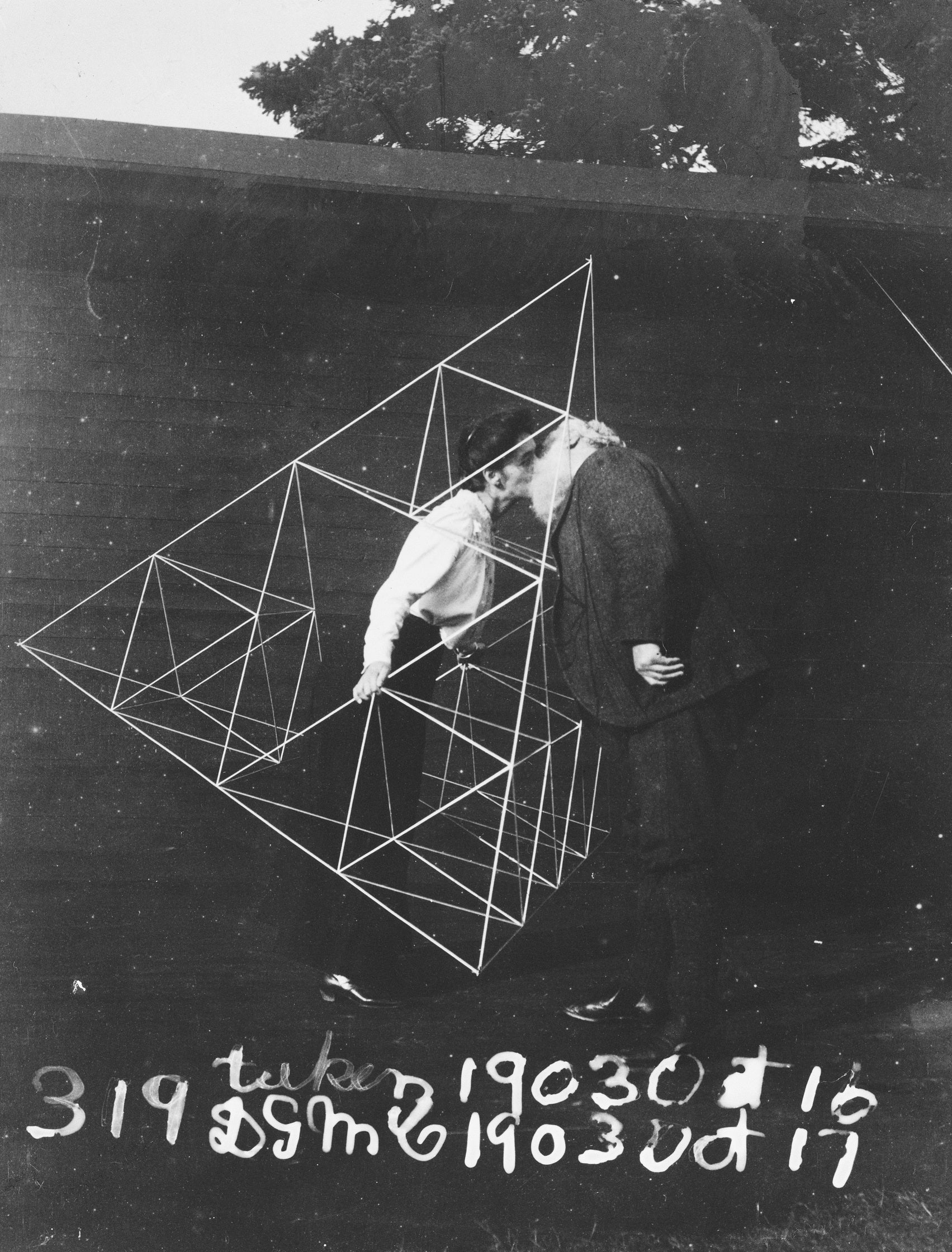 A photograph of Alexander Graham Bell and his wife Mabel Bell with a tetrahedral framework, called a Space Frame, designed by Bell as part of his research into powered flight. A fleeting moment both of a kiss and of a connection.